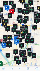 充電器の場所はアプリで検索しているのだが、たとえば京都周辺で見てもこれだけある。